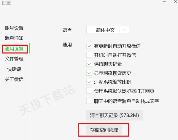 2.在左侧选择“通用设置”,点击页面下方“存储空间管理”。