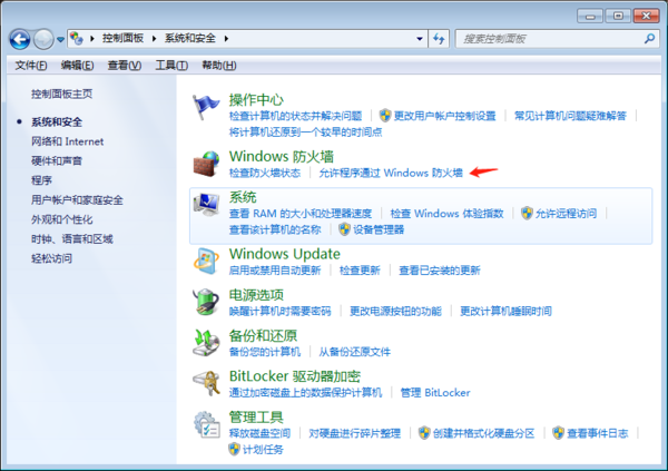 第三步,选择Windows防火墙中的“允许程序通过Windows防火墙”功能;