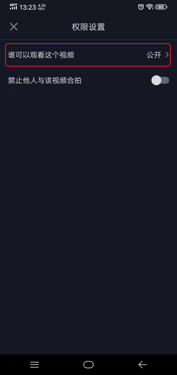 第五步,然后软件就会进入到【权限设置】的界面中了,在此界面中,我们可以对【谁可以观看这个视频】的权限来进行设置,默认是的【公开】,点击【谁可以观看这个视频】选项。