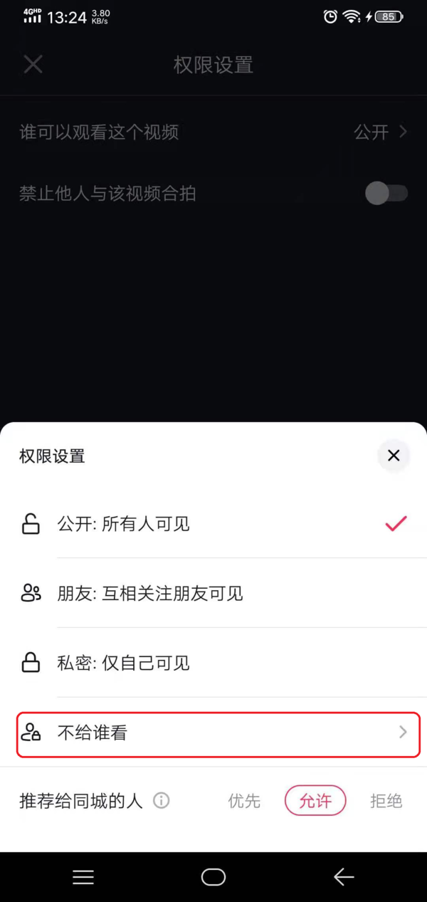 以上则是为大家总结的关于抖音不给他看的权限的设置方法了,如果你平时也不想让某个人看你的抖音作品的话,那么不妨赶快跟着本文将此方法学到手吧,这样一来,日后在发布短视频作品的时候,就可以更加轻松快速的设置好不让他看的权限了,这样我们的作品发表的也可以更加的有特定性。