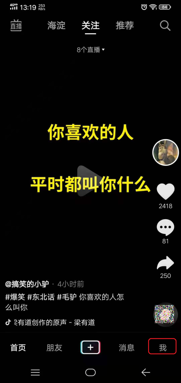 第一步,在手机的屏幕上找到抖音App,然后点击进入,进入到抖音的主界面当中后,我们找到界面右下角的【我】选项,并点击进入。