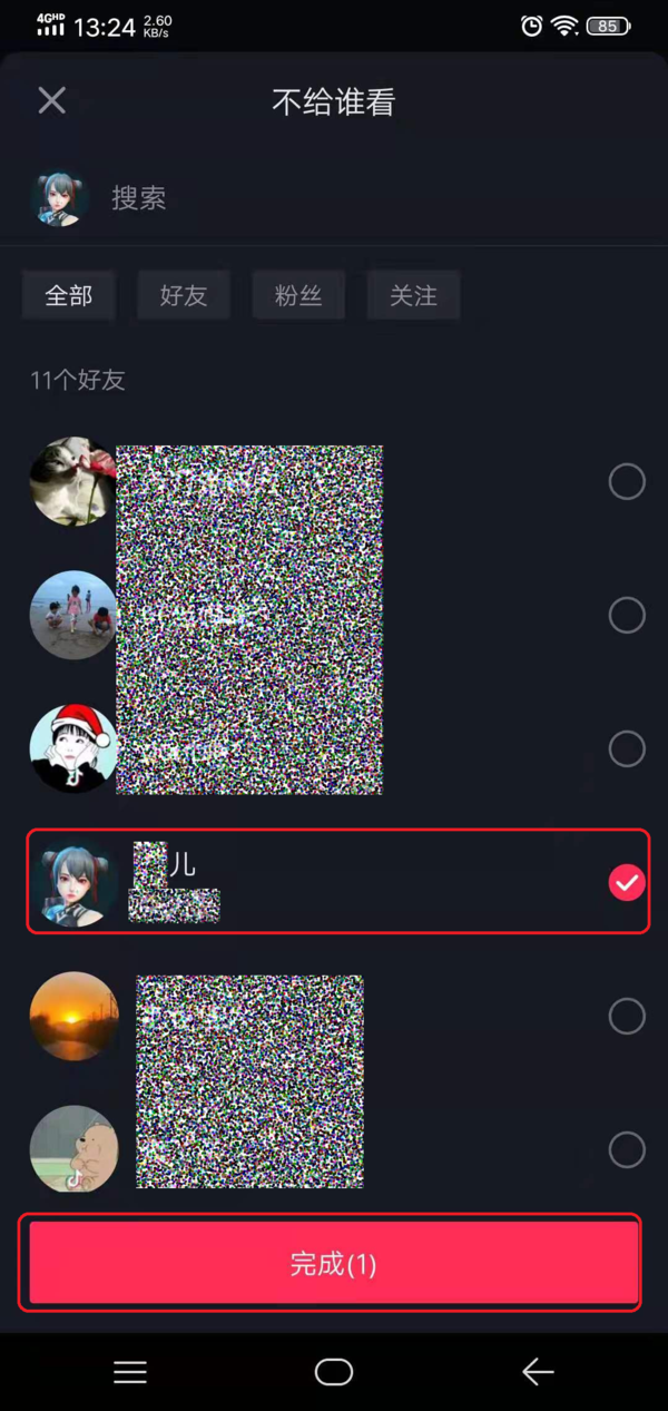 第七步,然后软件就会弹出【不给谁看】的选择列表了,选择一个或几个不想让他看的好友,并进行勾选,然后点击【完成】按钮。