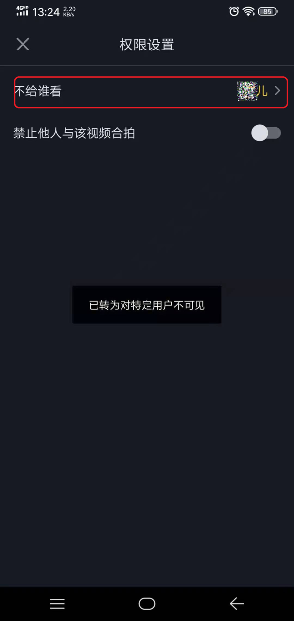 第八步,最后我们就设置好了抖音不让他看的权限了,此时在【权限设置】界面中,还是显示这个视频不给谁看的好友的名字,很直观。