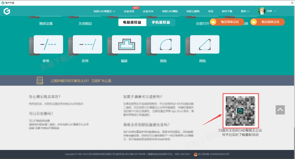 接着,将弹出的【账户升级】界面滑动到最底部,找到底部右侧的二维码,扫描这个二维码并关注浩辰CAD看图王的公众号,然后根据在公众号里输入【退款】,最后根据提示,提供相关的扣款截图、云图账号等信息,最后等待退款即可。这里的退款流程为使用微信或支付宝进行购买的用户。