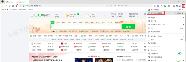 1.打开360浏览器客户端,点击右上角三条横线,选择“打开新的无痕窗口”。