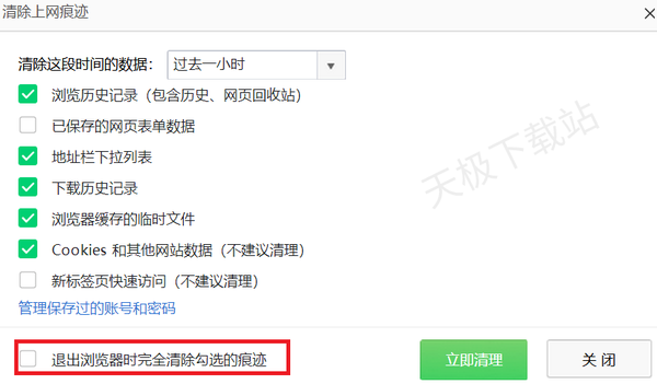 3.如果不想留下痕迹还有一种简单的方法,点击右上角三条横线,选择“更多工具”中的“清除上网痕迹”,然后勾选不想留下痕迹的选项,以及下方每次退出都自动清理的选项,这样我们每次退出浏览器系统就会自动清除了。