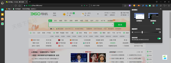 1.打开360浏览器客户端,点击右上角三条横线,选择“夜间模式”。