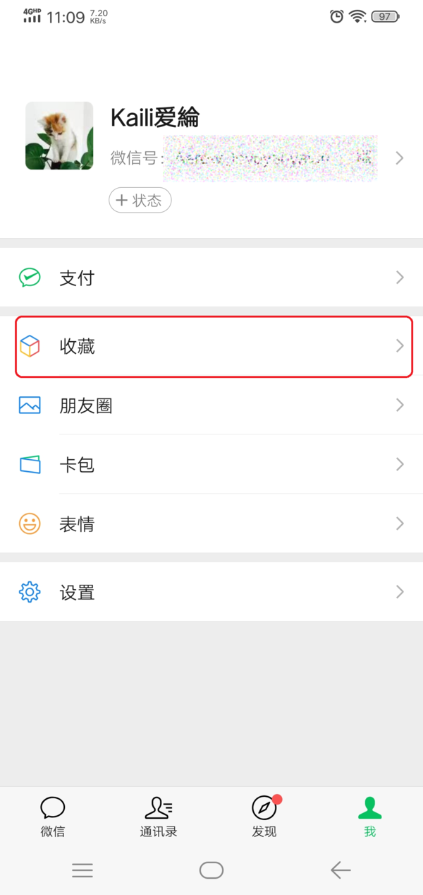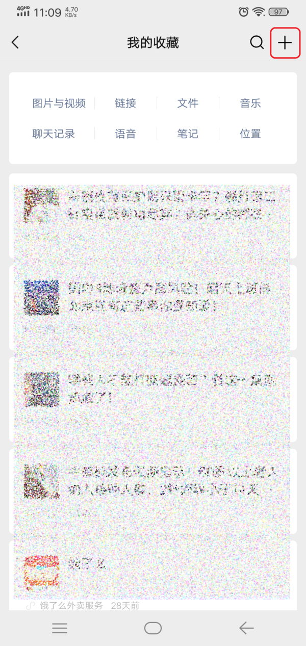 第三步,进入到微信的收藏界面当中后,我们找到界面右上角的【+】加号按钮,然后点击它。