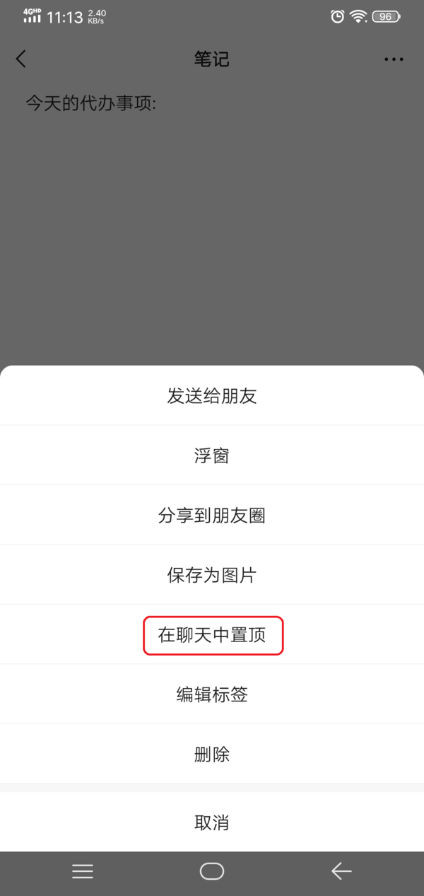 第五步,然后软件界面中会弹出一系列的选项,此时我们选择【在聊天中置顶】选项。