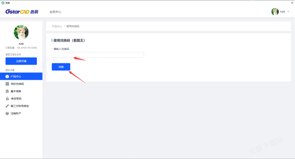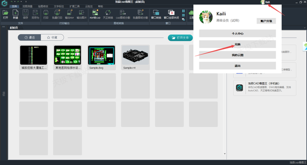 第一步,启动电脑端的浩辰CAD看图王,然后登录自己的账户。接着点击界面顶部右上角的【个人头像】图标,然后点击弹出的小窗口中的【兑换】按钮。