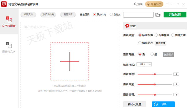 闪电文字语音转换软件支持文字语音互转,拥有多种语音类型,包括了各种场景,支持中英文朗读,而且可以添加背景音乐,朗读时的语音,语调,音量都可以自由调控,是一款非常专业的文本朗读软件。