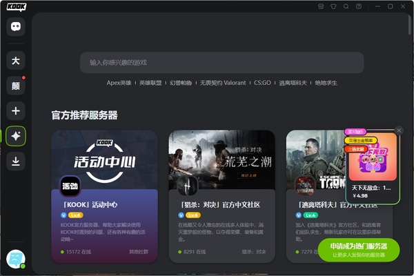 Kook非常注重游戏玩家的实际需求,提供了清晰、流畅的语音服务,让玩家们在游戏中能够更好地沟通、协作。无论是在大型多人在线角色扮演游戏、竞技类游戏还是休闲对战中,Kook语音都能够为玩家们提供稳定的语音连接,确保游戏中的沟通畅通无阻。而且,kook也不会和游戏抢占电脑的内存,从而极大程度地保证我们的游戏体验。