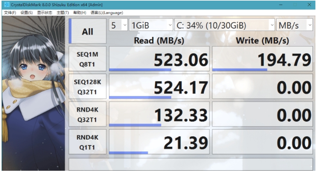 界面上可以查看各项测试的数值,比如连续读写数值、随机读写数值等。