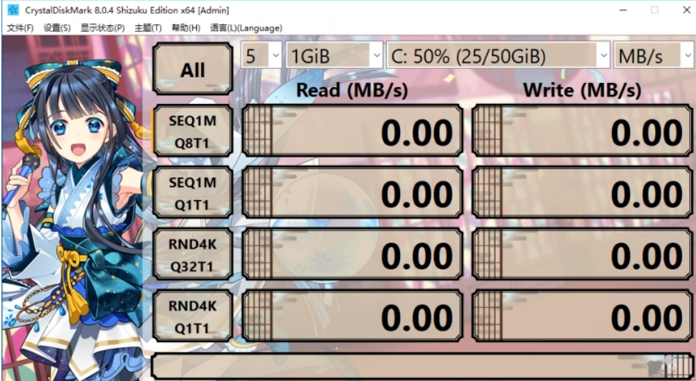 打开CrystalDiskMark软件,选择要测试的磁盘(如固态硬盘或机械硬盘)