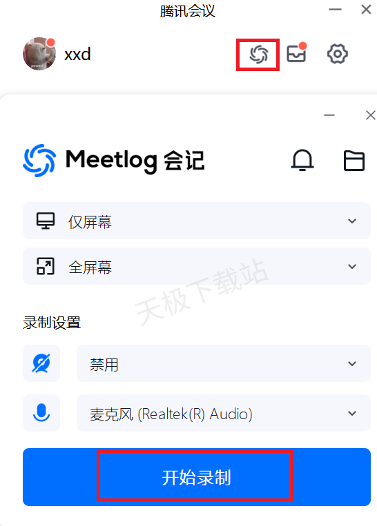 方法一:如图,点击腾讯会议客户端右上角框住的选项,即可直接开始进行录制。