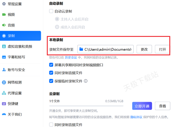 2.点击设置界面左侧第四栏“录制”,可以看到本地录制有视频录制文件保存地址。