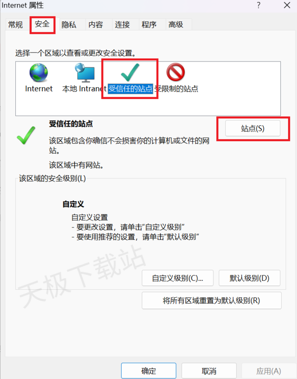 4.选择“安全”中的“受信任站点”,点击“站点”添加受信任的网站。