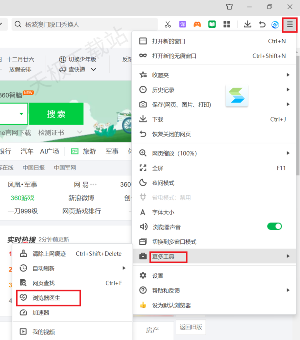 1.打开360浏览器,点击右上角“三条横线”,将鼠标划到“更多工具”,点击“浏览器医生”。