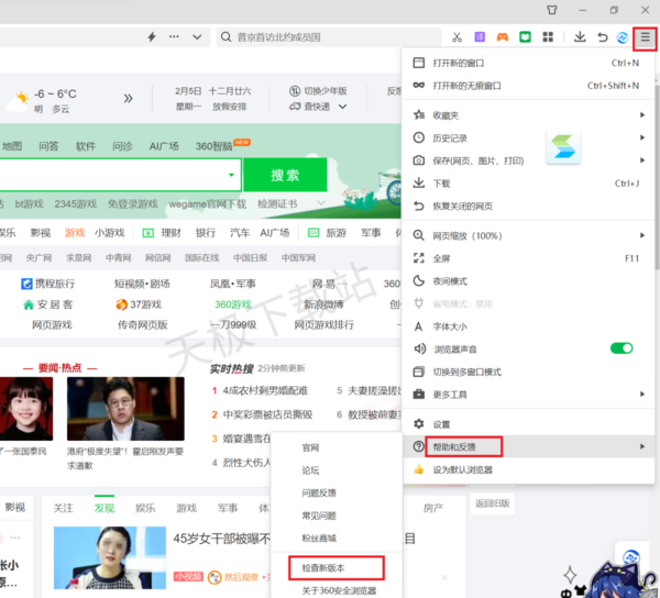 1.打开360浏览器,点击右上角“三条横线”,将鼠标划到“帮助与反馈”,点击“检查新版本”。