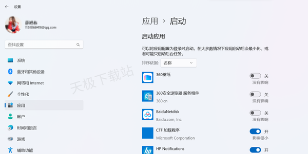点击电脑左下角win选项,依次进入设置--应用--启动,在此页面可控制开机启动软件。