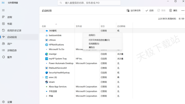 2.在任务管理器左侧“启动应用”,在对应的软件处右键即可设置“开启/关闭”。
