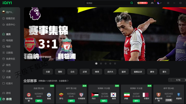 爱奇艺可以免费观看2024亚洲杯半决赛直播,我们打开爱奇艺客户端,点击页面左侧“体育”,然后选择“全部赛事”。