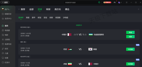 在新的页面点击上方“足球”,第一栏就是亚洲杯,可以看到半决赛的两场直播,都是免费的。