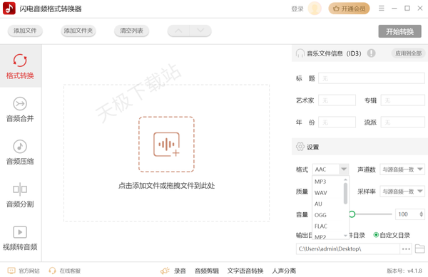 闪电音频格式转换器的功能非常齐全,而且支持转换的音频格式非常多,此外还有音频合并、压缩、分割,视频转音频功能,是一款专业的音频编辑软件。