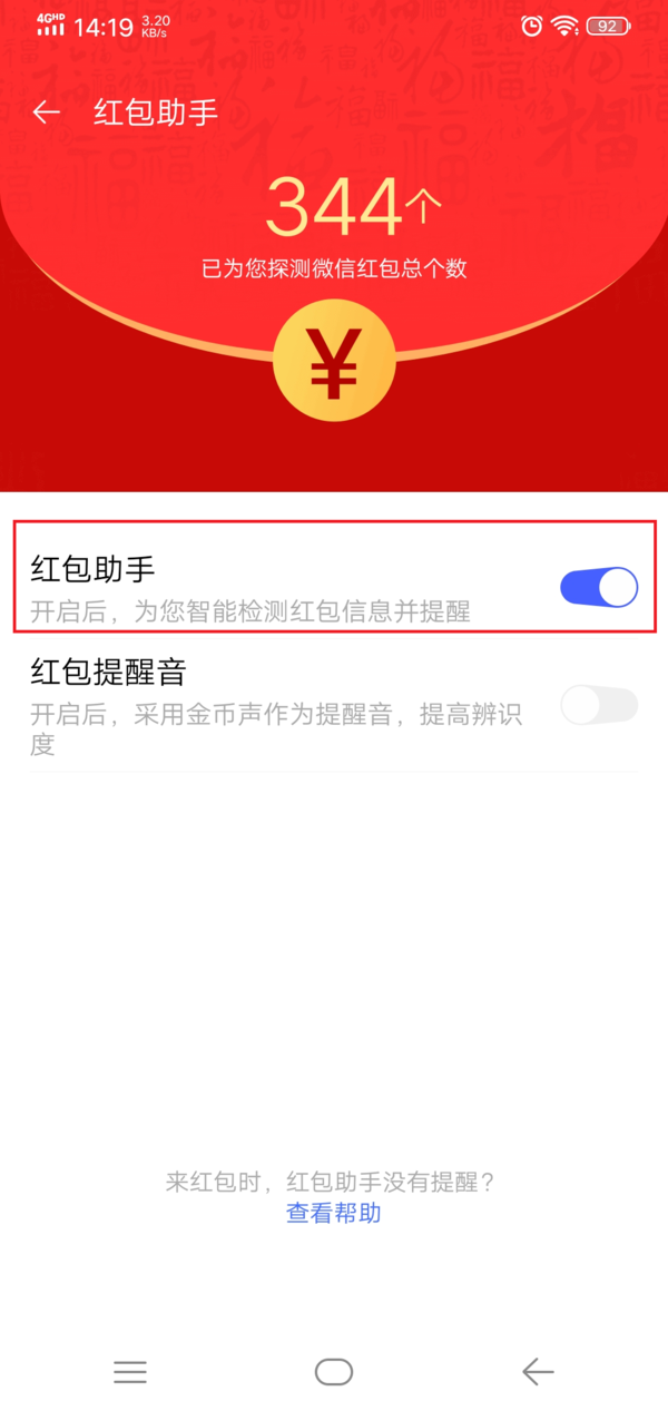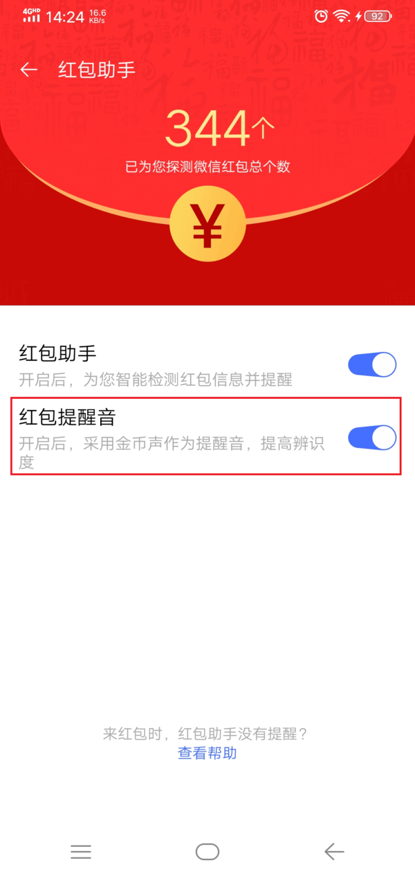 第六步,接着我们再将【红包提示音】功能的开关也滑动打开,开关变成蓝色就代表功能成功开启了。