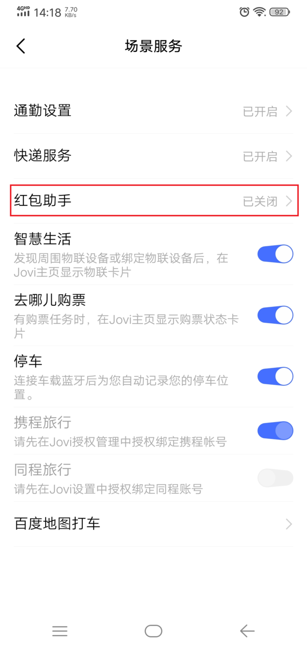第四步,进入到手机的场景服务设置界面后,在此界面中找到【红包助手】功能,并点击打开。