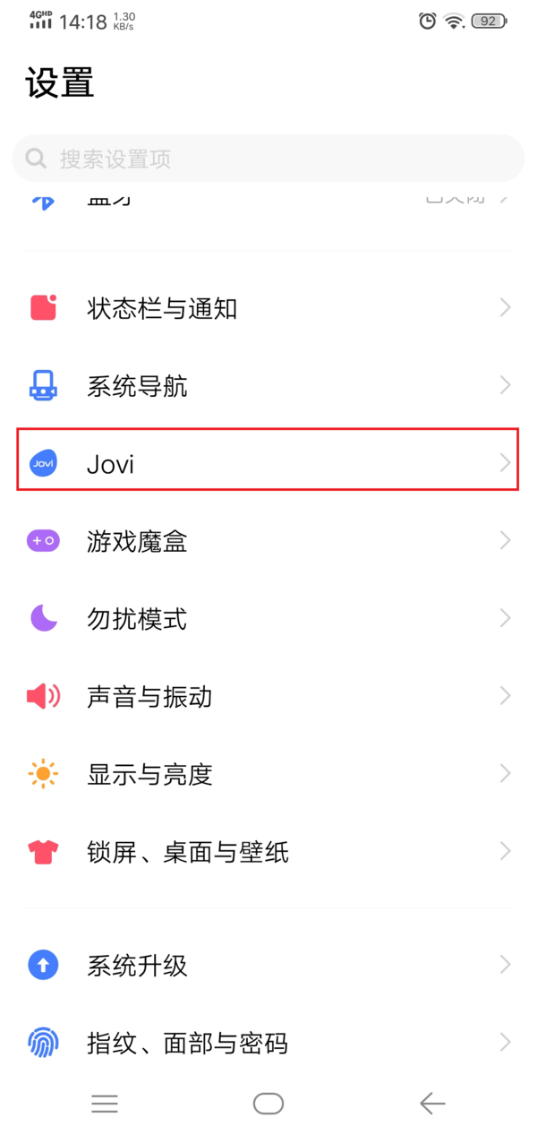 第二步,进入到手机的设置界面后,在此界面中找到【Jovi】功能,并点击打开。