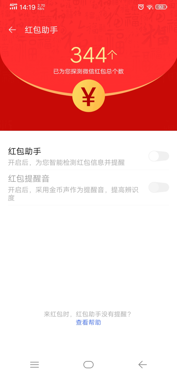 第五步,进入到手机的红包助手功能设置界面后,我们先将【红包助手】功能的开关滑动打开。