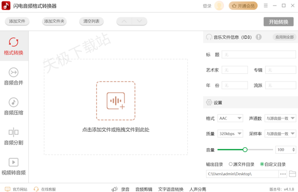 闪电音频格式转换器的功能非常齐全,有格式转换,音频合并、压缩、分割,还有视频转音频,支持的音频格式也很多,包括mp3,flac,wav,ogg等,非常好用。