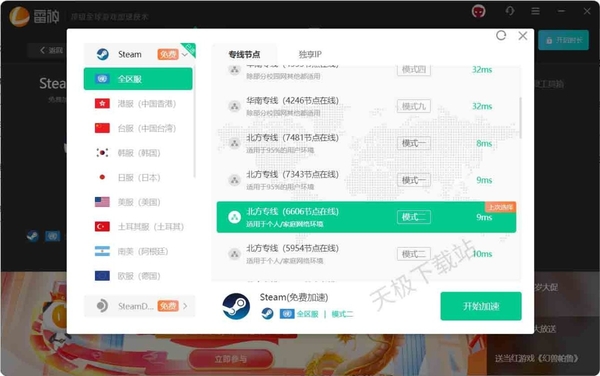 5.选择好线路后,点击开始加速按钮,雷神加速器将会开始为您加速Steam。