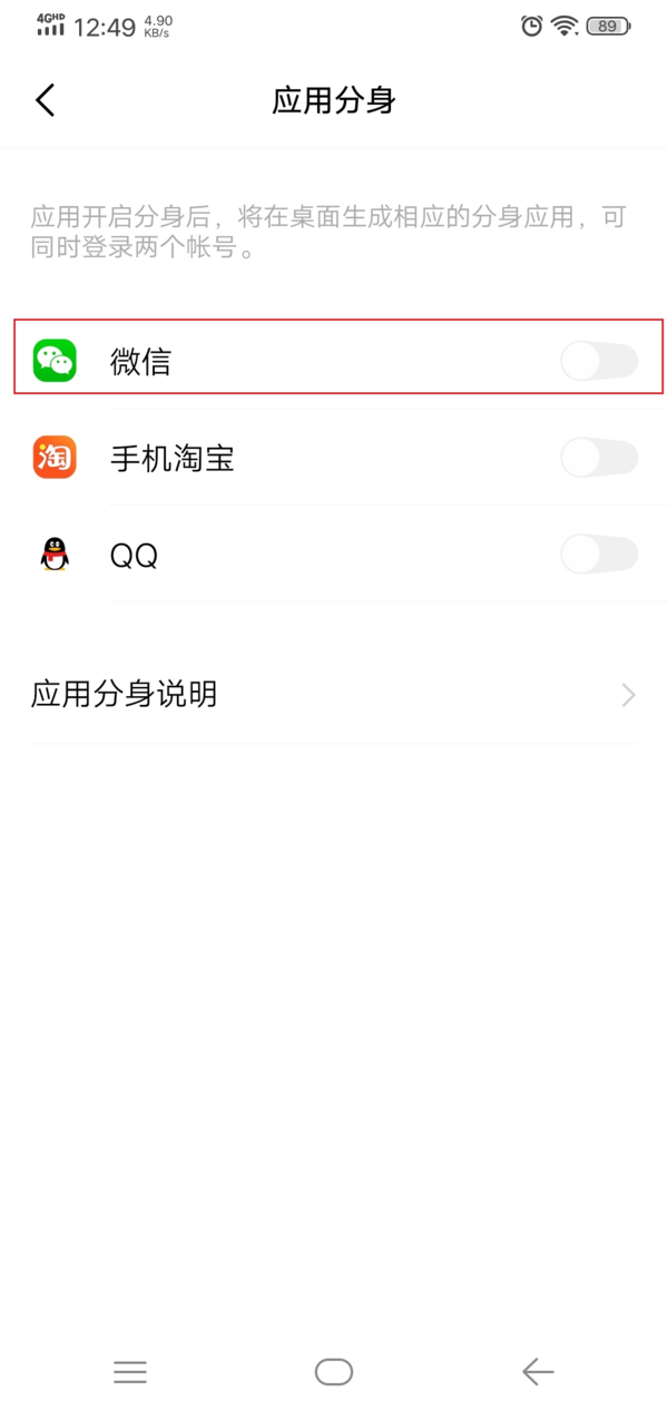 第三步,进入到应用分身界面后,我们找到需要打开分身功能的微信,然后将其右侧的开关滑动打开。