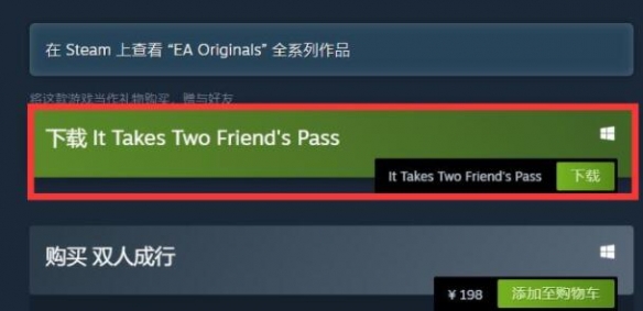 1、购买本体的玩家购买后在商店页面下载游戏,没有购买游戏的玩家需要下载上方绿色的双人成行好友通行证。