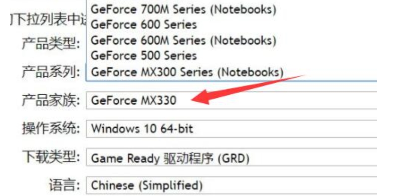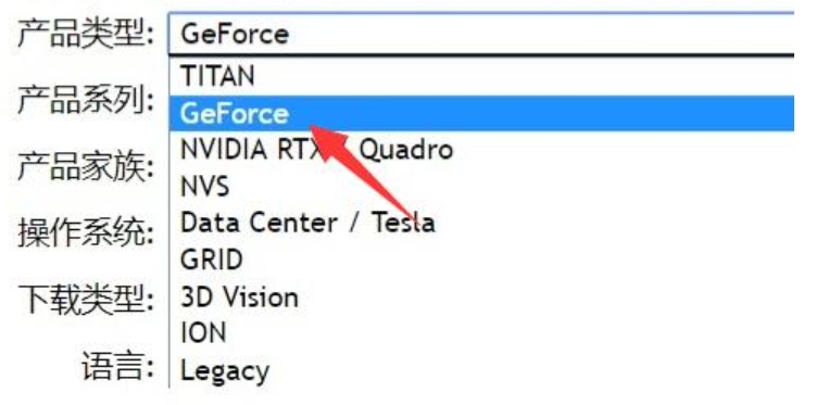 页面前面的GeForce就是产品类型,在产品类型里进行选择即可