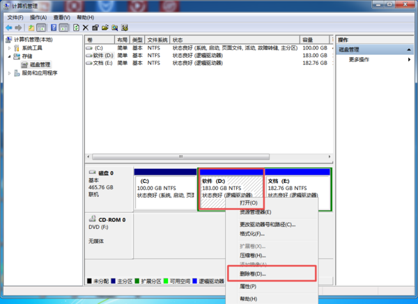 第三步,接着我们找到【D盘】然后按下鼠标的右键,在弹出的选项中选择【删除卷】选项。这里需要注意的是,我们在删除D盘之前,一定要记得将D盘中的重要资料拷贝到电脑的其他磁盘当中,避免数据的丢失。
