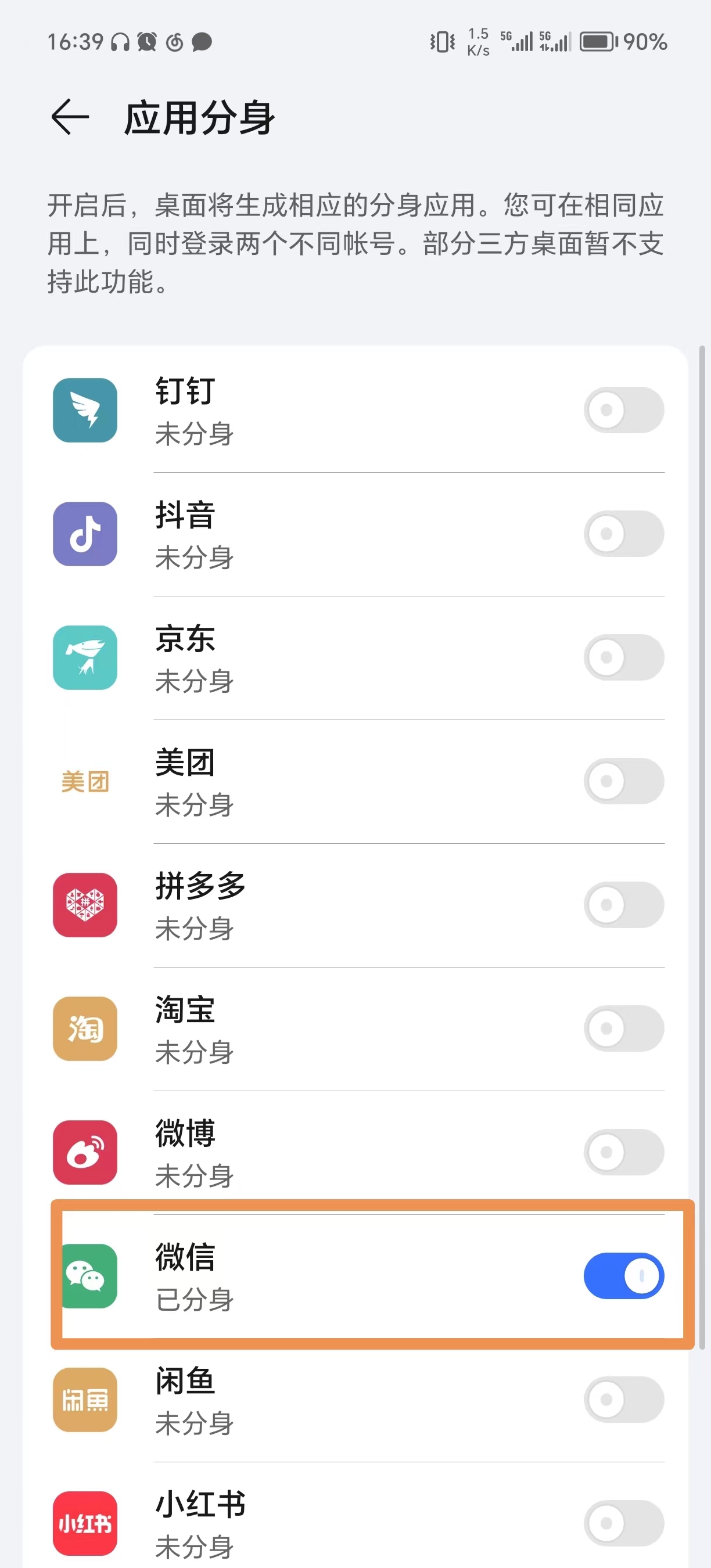 步骤4:在应用分身的页面中,点击微信选项,打开这个选项;