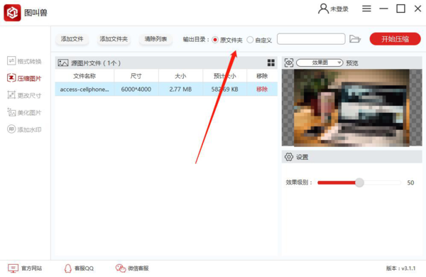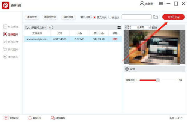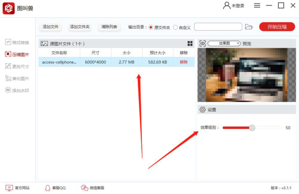 第三步,图片添加成功后,我们找到软件界面右下角的【设置】选项,在这里我们可以设置图片压缩的【效果级别】,级别越高,压缩的就越小。在软件的中间位置,我们就可以看到原图的大小和预计压缩图片的大小,对比看看就知道了。