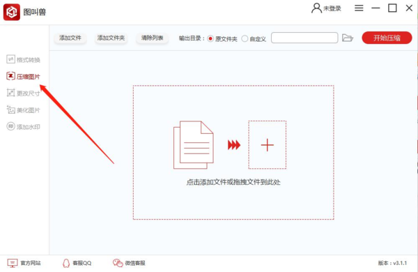 第一步,在电脑上下载并安装图叫兽软件,软件安装成功后,双击打开。进入到软件的主界面当中后,我们在软件界面的左侧,选项需要使用的功能,比如【图片压缩】,然后点击它。