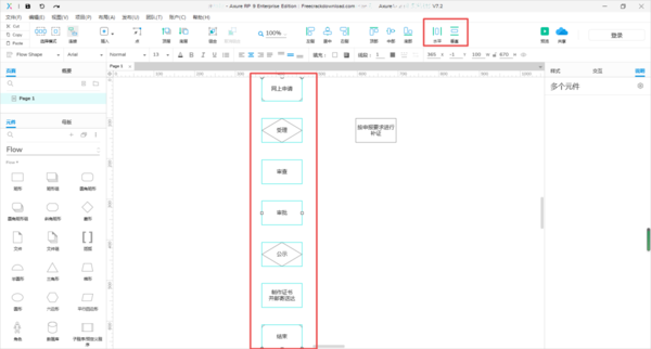第七步,接着我们还可以设置所有图形的对齐方式,选中需要设置的所有图形,然后点击软件界面右上角的【水平】或【垂直】对齐方式即可。