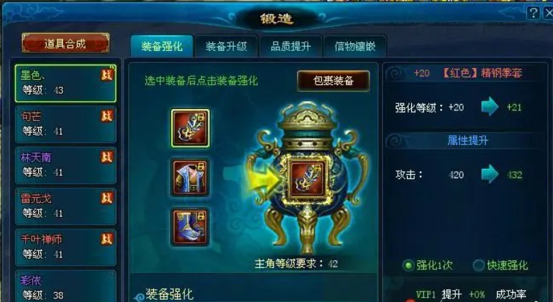 装备升级,装备升级提升战力,装备品阶分为灰色、绿色、蓝色、紫色还有橙色,通过提升装备的品阶还可以激活装备连锁效果,品阶越高增加战力越多。装备达成紫色品阶之后还可以镶嵌魄晶提升战力。每个装备也都是可以强化升级的,等级越高的装备的战斗力越高。