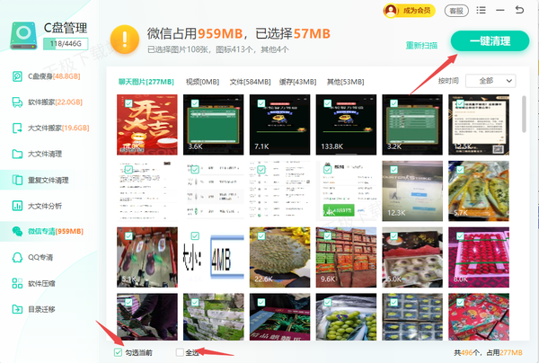 4、垃圾扫描完成后,大家根据自己的需求,来进行垃圾的勾选,包括【聊天图片】、【视频】、【文件】、【缓存】以及【其他】垃圾,选择完成后,点击右上角的【一键清理】按钮进行清理即可。