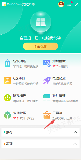 1、启动电脑端的Windows优化大师,接着点击【工具箱】功能。