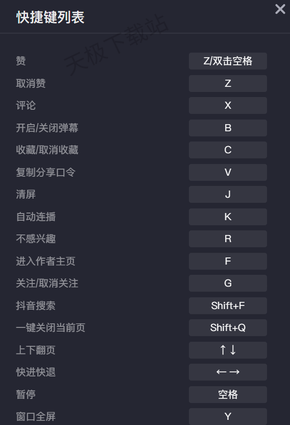 为了让用户能够在电脑上更加方便地使用抖音,抖音官方设置了诸多键盘快捷键,如图所示。