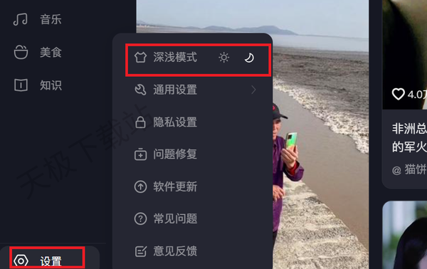 打开电脑抖音,在左下角找到“设置”,将鼠标划到“设置上方”,可以看到弹出窗口最上面一行是“深浅模式”,这时候我们点击“太阳图标”就是浅色(白天)模式,点击“月亮图标”就是深色(夜间)模式。