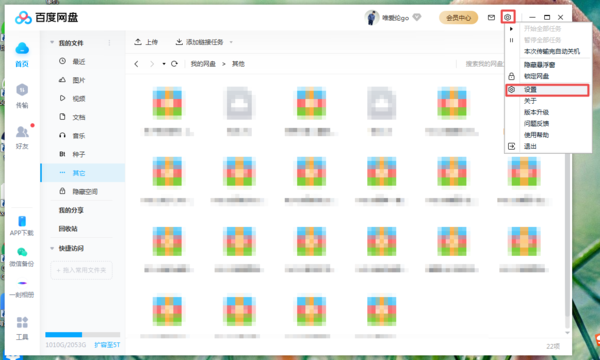 第二步,进入到百度网盘的主界面当中后,我们找到软件界面右上角的小齿轮【设置】图标,并点击。接着在其弹出的一系列选项中,我们找到【设置】功能,并点击打开。