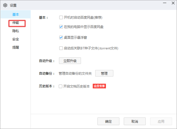 第三步,然后软件就会弹出百度网盘的【设置】窗口,在此界面的左侧,找到【传输】功能,并点击打开。