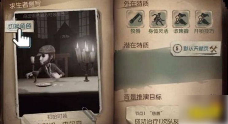 3、选择左下角的黄色书页,弹出求生者的详细资料,点击左上方的“切换角色”按钮。